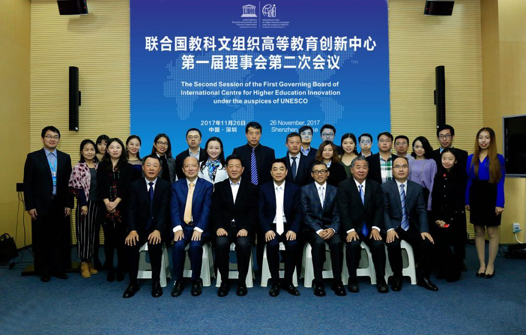 The Second Session of the First Governing Board of International Centre for Higher Education Innovation (ICHEI) under the auspices of UNESCO was successfully held in Southern University of Science and Technology (SUSTech) on November 26, 2017. Mr. GAO Zimin, Deputy Mayor of Shenzhen Municipality and newly appointed Chair of the Governing Board of ICHEI, hosted the meeting. Also present at the meeting were Mr. DU Yue, Secretary-General of the National Commission of the People’s Republic of China for UNESCO, Mr. CHEN Yidan, Core Founder and Adviser Emeritus of Tencent, Founder and Honorary Chairman of Tencent Charity Foundation, Mr. CHEN Shiyi, President of SUSTech, Mr. Freddy Boey, Vice President of Nanyang Technological University, Mr. XU Jianling, Deputy Director of the Bureau of Education of Shenzhen Municipality and Mr. LI Ming, Director of ICHEI.