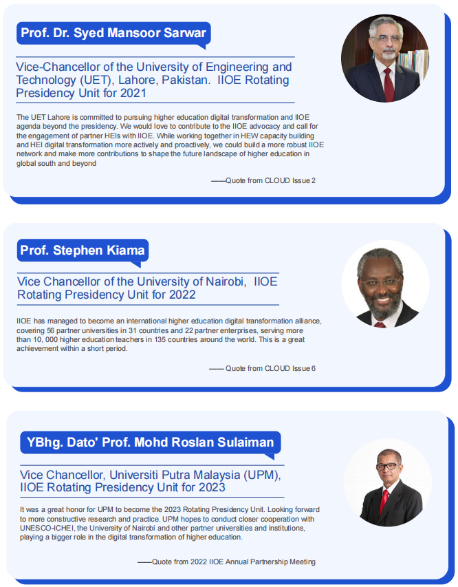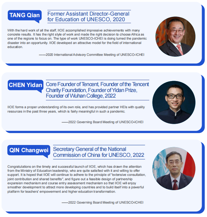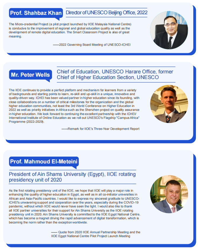 As a global teacher training platform that has only been live for three years, IIOE still has a long way to go to achieve its goal of efficiently realizing digital transformation in empowering development. IIOE is still in the process of continuous practice, exploration, and iteration. In the future, how to scale up IIOE's operations, how to emphasise the quality of IIOE's activities, and how IIOE and UNESCO-ICHEI could extend their current role and become a think tank are important topics for the next stage of IIOE. The current development practice of IIOE proves that "things are done by people, and roads are built by people". I believe that as long as we keep up with the trends of global development, and closely align with partners' needs, operate with a scientific attitude, exert a spirit full of wisdom and uphold perseverance, down-to-earth, step-by-step, IIOE can grow into a flagship and active agent for the digital transformation of higher education in developing countries in the future. ——Director, LI Ming UNESCO-ICHEI |