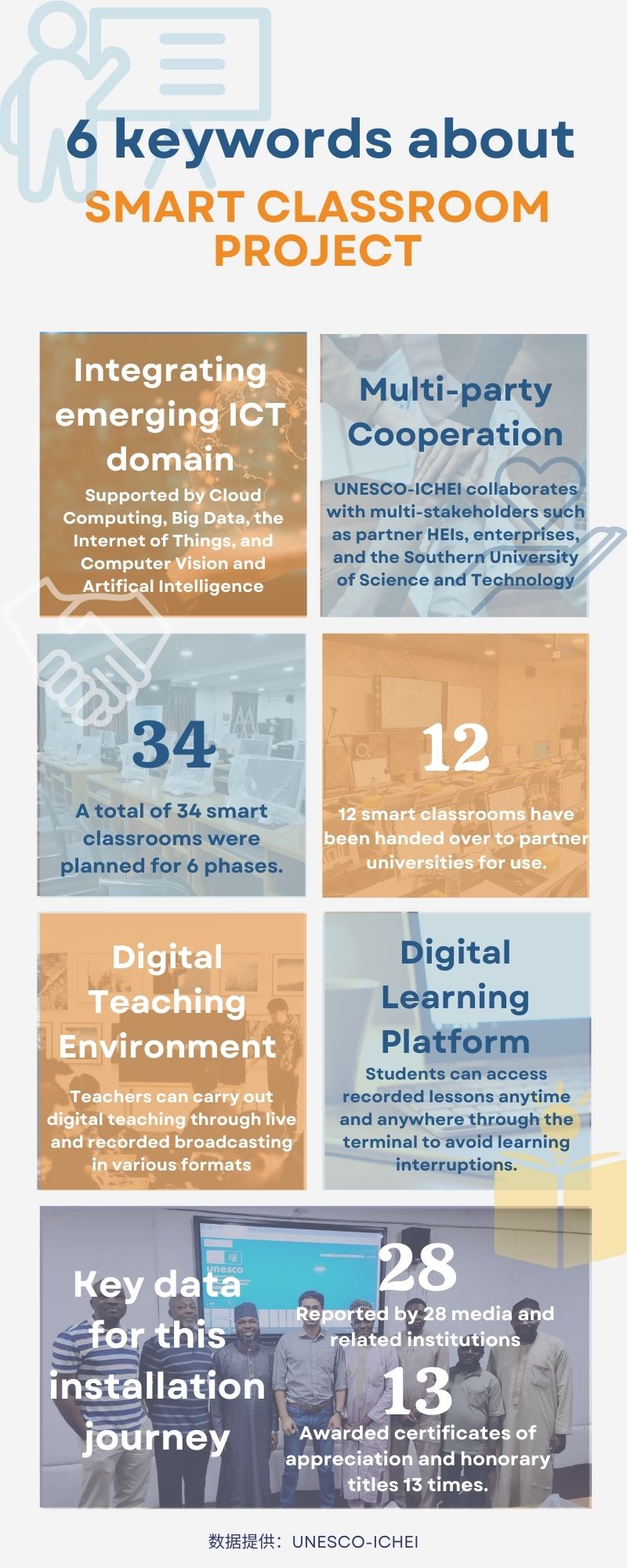 These smart classrooms are a multi-party collaborative project, generouslydonated by Guangzhou Createview Education Technology Co., Ltd., coordinated by UNESCO-ICHEI, supported by the Southern University of Science and Technology (SUSTech),and implemented at partner universities. SCR finally landed in the partner universities of UNESCO-ICHEI, where the smart classrooms installed were all the very first in the universities. From April 2022 to October 2022, UNESCO-ICHEI sent technical officials to the 4 countries where the smart classroom projects are located for on-site installation and training. From decorating of the classroom facilities in the early stage of equipment installation, to troubleshooting and commissioning, till the induction sessions and staff training to the official launch of the SCR facility, UNESCO-ICHEI assisted partner universities to complete the whole project implementation process of SCR, ensuring smooth project's functioning and handover by maximizing the value after delivering the SCR to the partner universities and bringing more opportunities for their future teaching and learning activities.