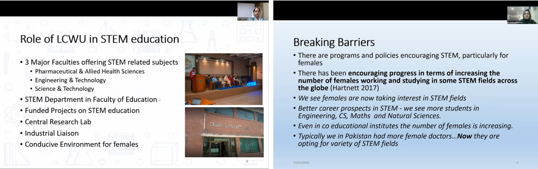 At the end of the webinar, Professor Bushra Mirza, Vice Chancellor of LCWU, expressed her gratitude for being invited to attend this webinar. She introduced the project promoting women's professional development in STEM education developed by Rajal Women's College in cooperation with other Pakistani higher education institutions. With the complementary advantages of institutions, this project has trained many female teachers in STEM education. LCWU is committed to helping excellent women in STEM disciplines in higher education achieve academic advancement and self-growth.