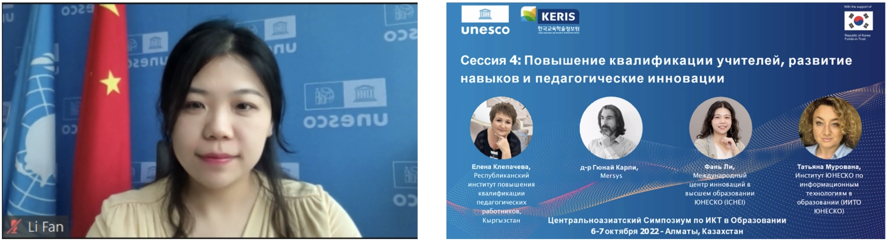 During the session Teacher Capacity Building, Skills Development Pedagogical Innovation, Ms. Elena Klepacheva, Senior Lecturer at Republican Institute for Professional Development of Pedagogical Workers under the Ministry of Education and Science of the Kyrgyz Republic, Dr. Gunay Karli, Chief Scientific Officer at IT-company "MERSYS", Ms. Li Fan, Assistant Director Chief of Asia-Pacific Programme Office at UNESCO-ICHEI and Ms. Tatyana Murovana, Programme Specialist at UNESCO Institute for Information Technologies in Education, shared relevant practices in empowering teachers with digital skills from the perspectives of the government education sector, the private sector and UNESCO. Specifically, Ms. Li fan gave a presentation on Digital Transformation of Higher Education: Engagement and impact of International Institute of Online Education. By looking at the need for digital transformation of higher education, she pointed out the major challenges facing Central Asian countries in the efforts towards transforming their higher education systems, which requires a more systematic and holistic approach. Afterwards, Ms. Li Fan gave a detailed introduction of IIOE, including its hardware and software support, partnership network, etc., and took stock of a series of collaborations between UNESCO-ICHEI and Central Asian countries within the framework of IIOE. She also revealed that UNESCO-ICHEI plans to establish an IIOE National Center in Uzbekistan which is supposed to serve as a think tank and capacity building hub to facilitate the digital transformation of higher education at country level. Finally, Ms. Li Fan made an announcement about the upcoming regional event focusing on digital transformation of higher education in Central Asia and beyond through digital technology, which will take place in late November and will be co-organized with UNESCO Almaty and other partner entities of UNESCO-ICHEI.