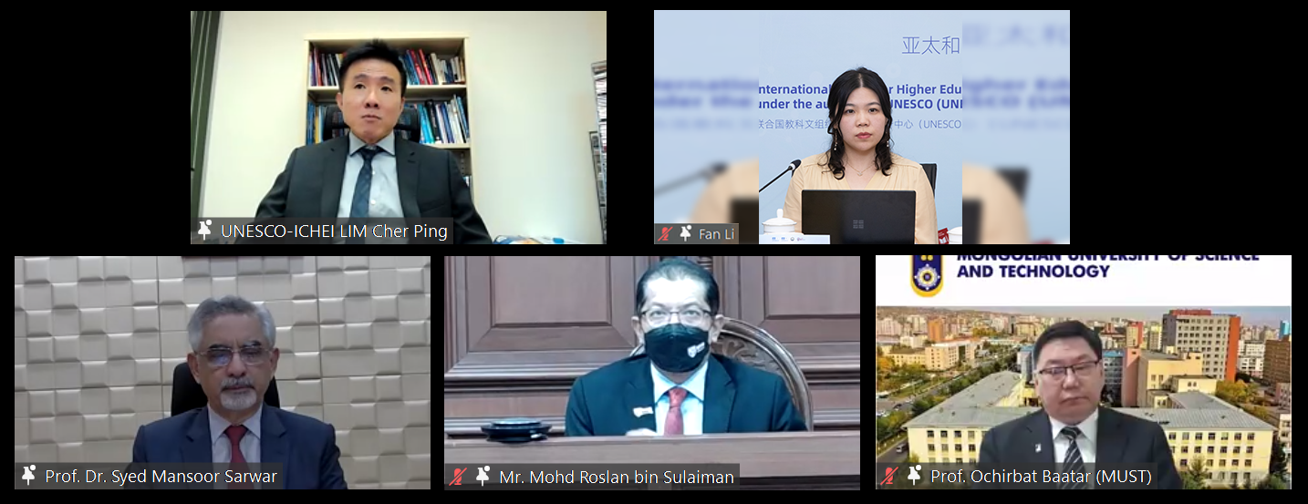 Prof. LIM Cher Ping, Chief Expert of IIOE and Chair Professor of Learning Technologies and Innovation at Education University of Hong Kong led the following session to introduce IIOE's two key initiatives. After an overview delivered by Ms. LI Fan, Assistant Director of UNESCO-ICHEI, university leaders from UET Lahore, Universiti Putra Malaysia (UPM) and Monoglian University of Science and Technology (MUST) officially launched the IIOE National Centres respectively. All three university leaders, Prof. Mansoor (UET Lahore), Prof. Sulaiman (UPM) and Prof. Ochirbat (MUST) shared their visions of IIOE National Centre and corresponding work plans for 2022. At the same time, Ms. Svetlana Knyazeva, Chief of the Unit of Digital Pedagogy and Learning Materials, UNESCO IITE, introduced the joint project of UNESCO-ICHEI and IITE to accomodate Russian speaking higher education workforce, and officially launched IIOE's Russian language platform.