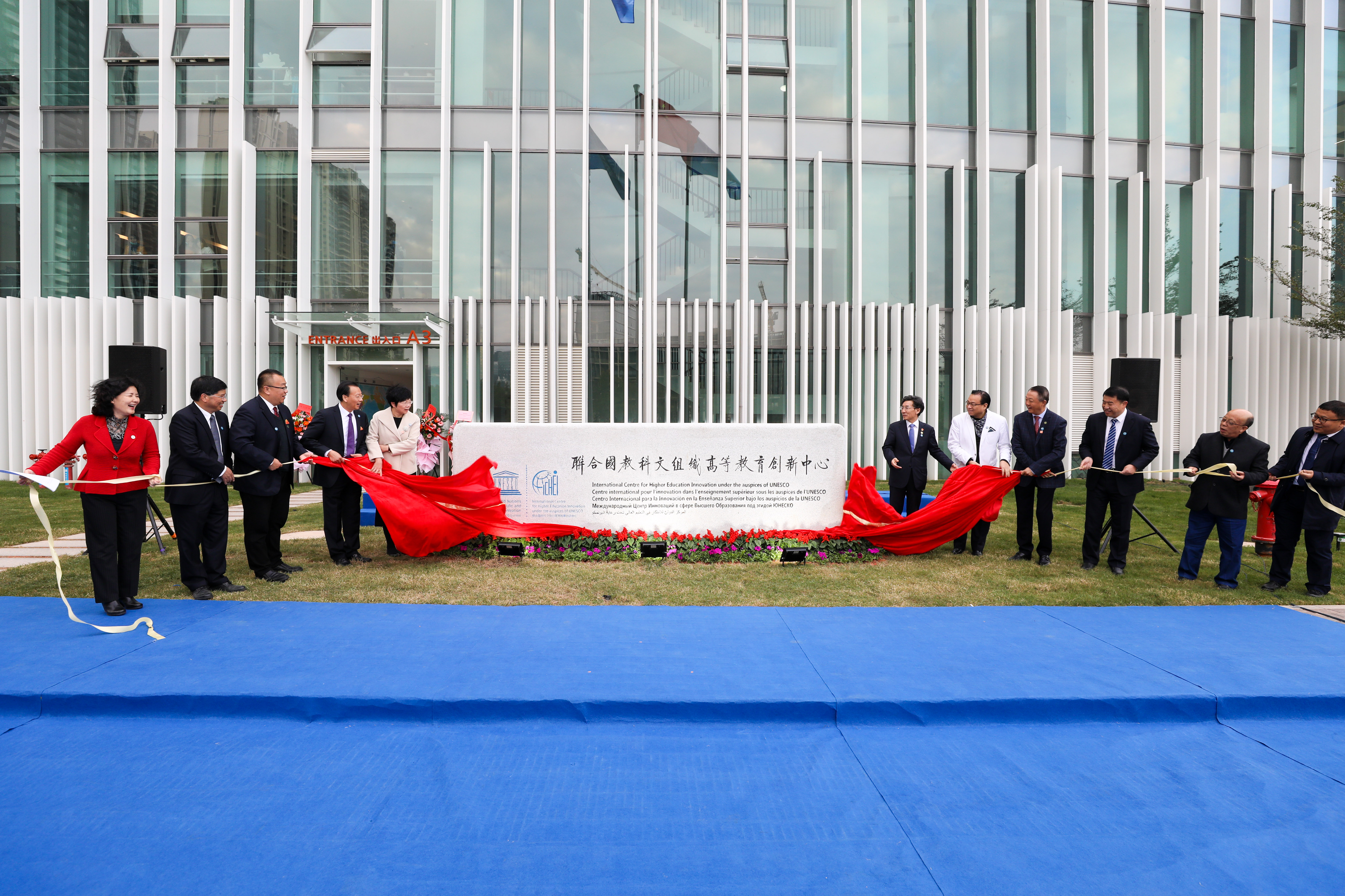 Leaders from SUSTech and UNESCO-ICHEI unveiling the Inscription Stone (From left to right: HAN Wei, ZHENG Chunmiao, CHEN Siqi, LI Fengliang, GUO Yurong, XUE Qikun, SHEN Mo, LIMing, LU Chun, CHEN Yuehong and Dr. ZHANG Ling)