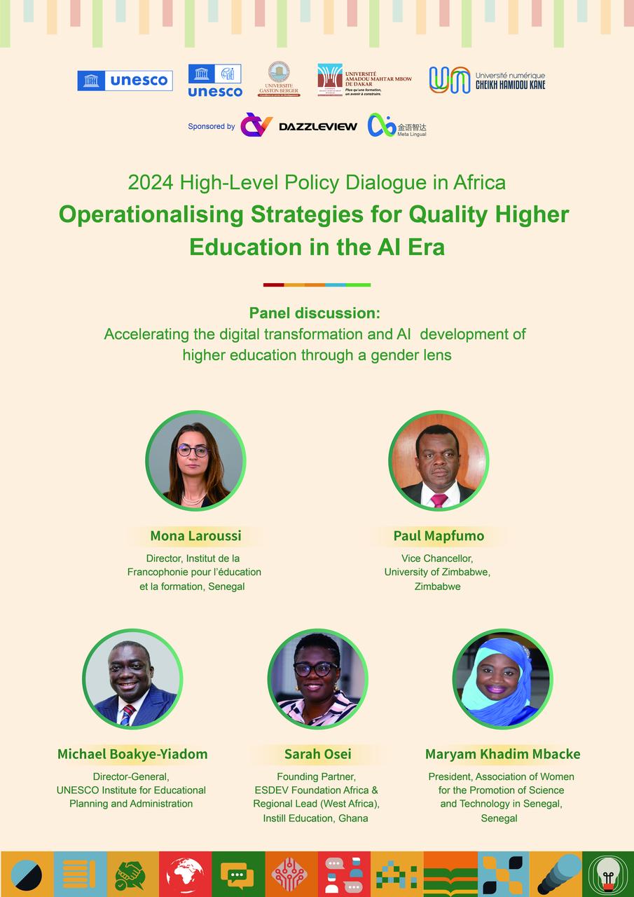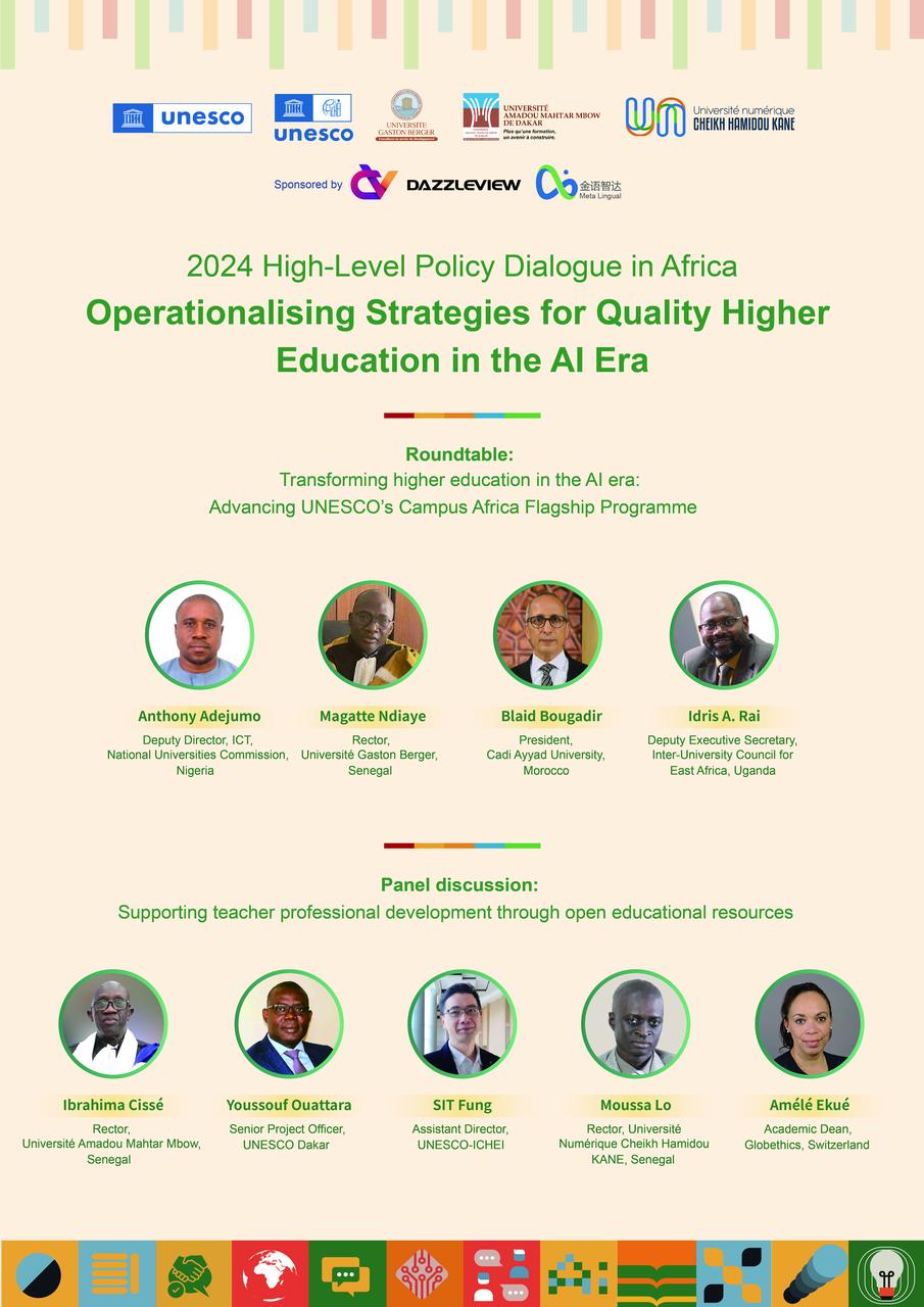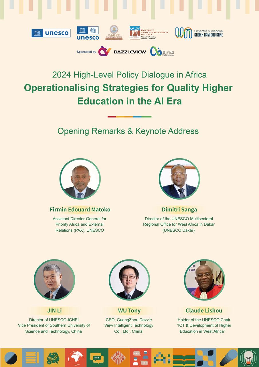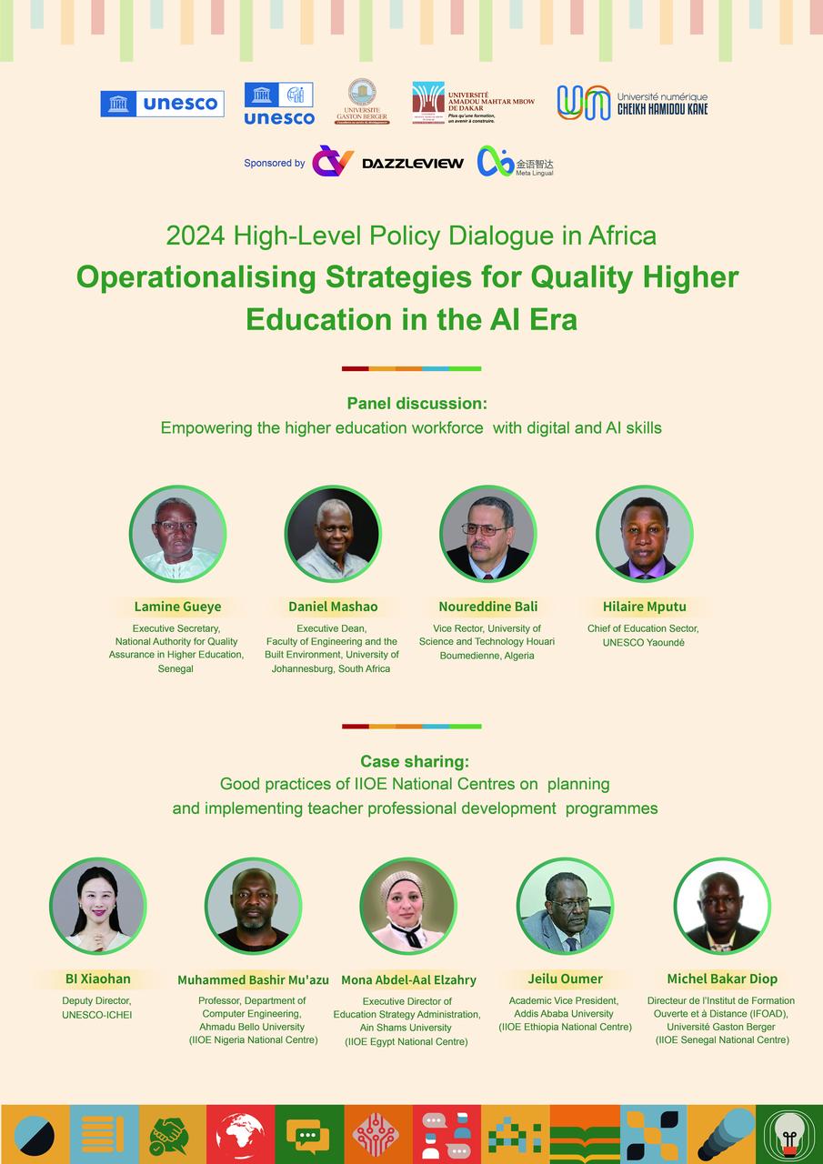 The 2024 High-Level Policy Dialogue in Africa, themed "Operationalising Strategies for Quality Higher Education in the AI Era", will be co-organized by UNESCO, UNESCO-ICHEI, and partner higher education institutions (HEIs) in Dakar, Senegal on 13th December, 2024. The policy dialogue will convene senior officials from government agencies overseeing higher education, HEI leadership and teaching personnel, private sector entities, industry professionals and experts, representatives from international and regional organisations, and other partners to explore the transformation of Africa's higher education in the AI era, with emphasis on the policy trends, gender equality, and teachers' professional development. UNESCO and UNESCO-ICHEI will jointly launch a multilateral cooperation project in support of the digital transformation of higher education in Africa at the event.