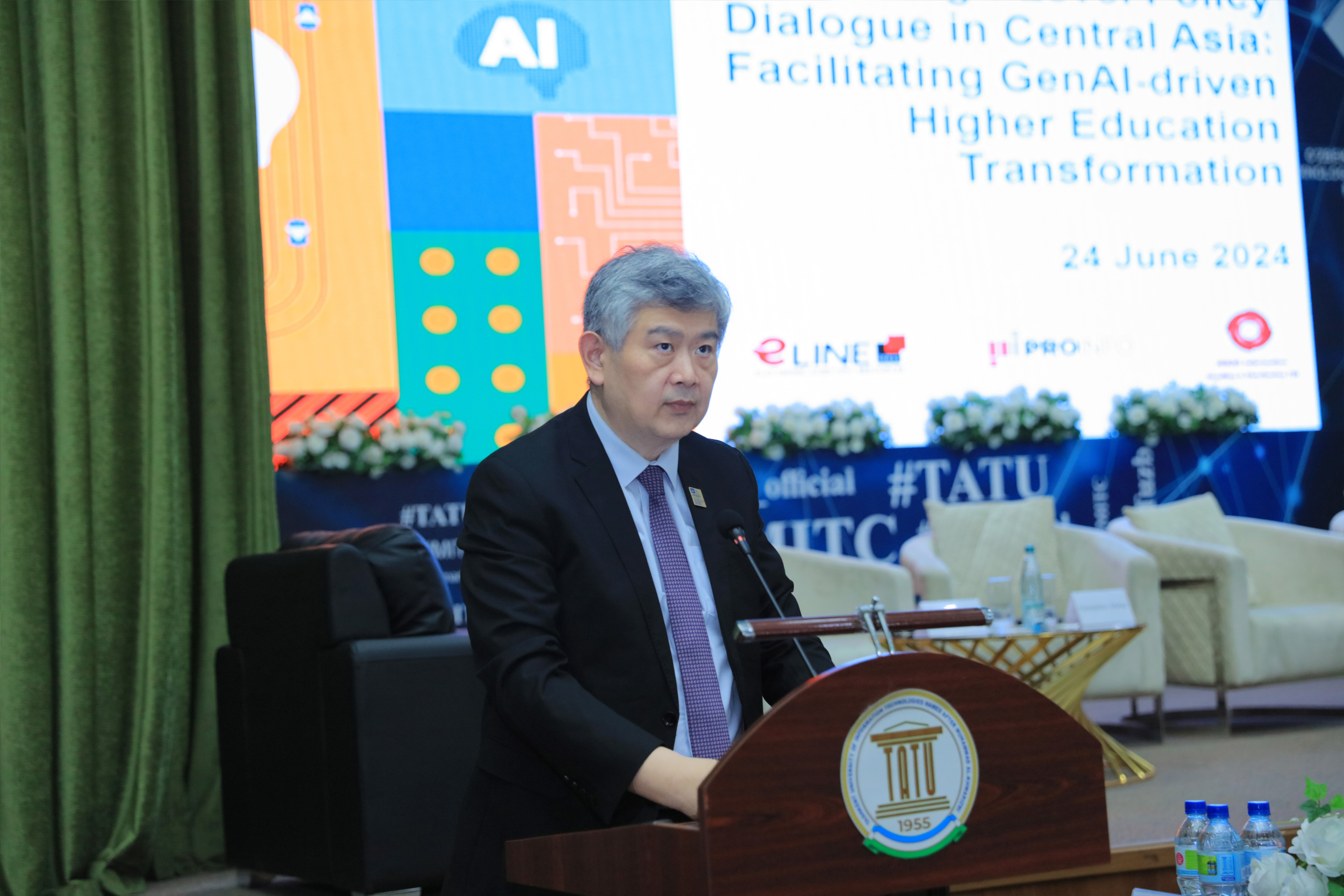 On June 24, 2024, the High-Level Regional Policy Dialogue in Central Asia themed "Facilitating GenAI-driven Higher Education Transformation" was successfully held in Tashkent, Uzbekistan. The Policy Dialogue was co-organized by the Tashkent University of Information Technologies (TUIT, IIOE Uzbekistan National Center), the UNESCO Institute for Information Technologies in Education (UNESCO IITE), the UNESCO Almaty Regional Office (UNESCO Almaty), and the International Centre for Higher Education Innovation under the auspices of UNESCO (UNESCO-ICHEI). The event was supported by Uzbekistan's companies: ELINE Press Ltd. and PROINFO Ltd.