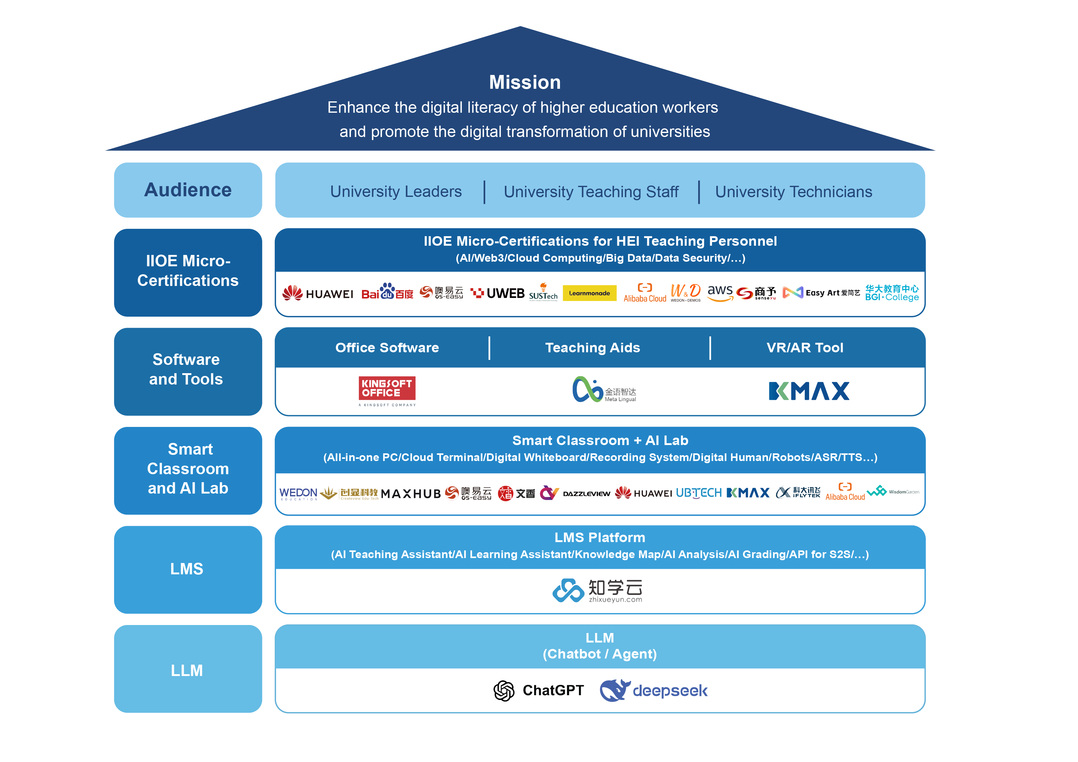 Diverse Cooperation with the Private Sector Private enterprises play a leading role in research and development as well as talent cultivation for higher education institutions. Collaborating with the private sector and fully leveraging their leading role in higher education is the unique advantage of IIOE. It provides diversified support for the IIOE ecosystem alliance in terms of software, hardware, talent cultivation, and capacity building.
