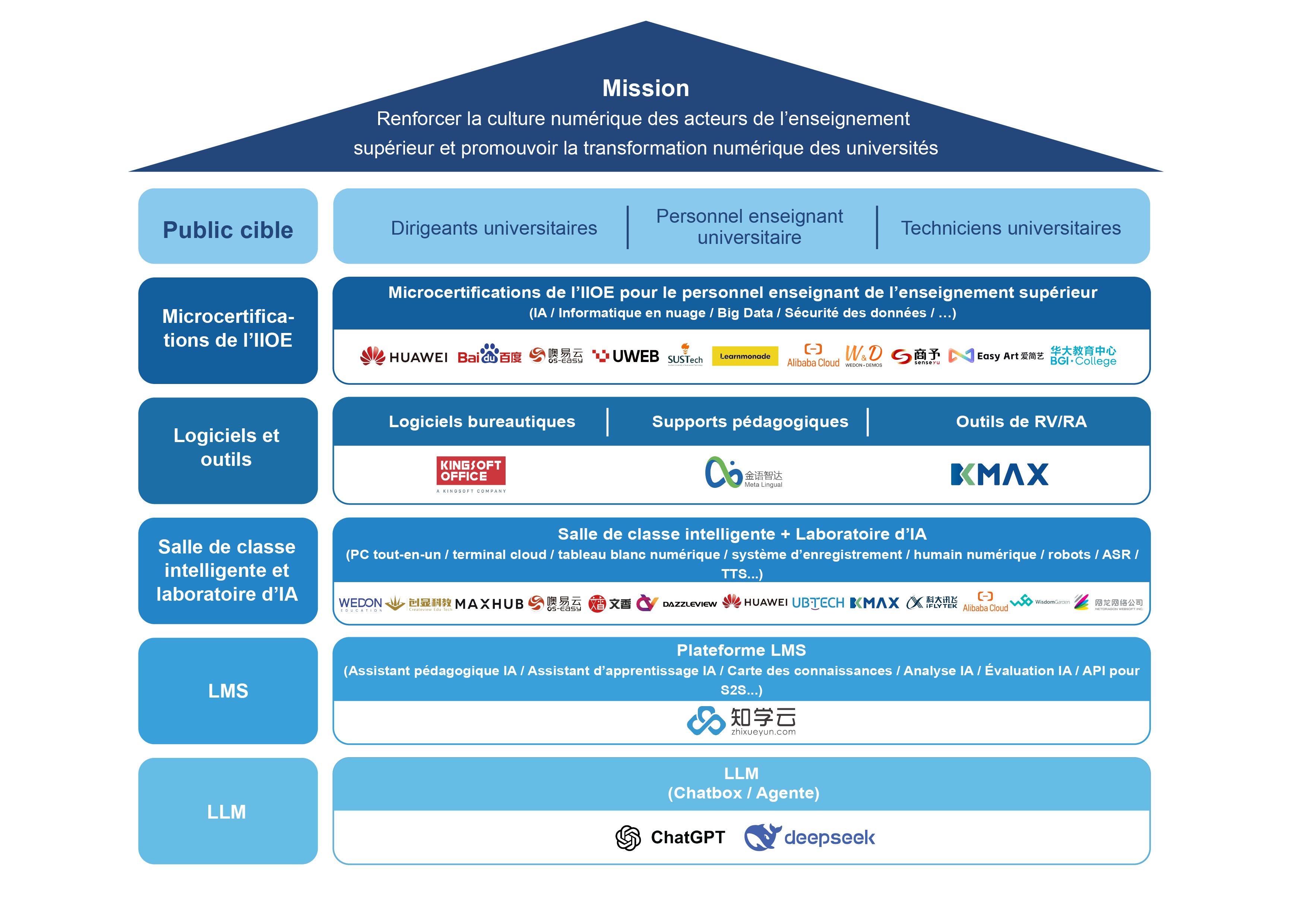 Dans ce contexte, l’NESCO-ICHEI s’est engagée à renforcer les compétences numériques et l’alphabétisation en intelligence artificielle du personnel de l’enseignement supérieur, en leur offrant des formations et un soutien au développement professionnel. En décembre 2019, l’UNESCO-ICHEI a lancé, en collaboration avec 11 établissements partenaires, des établissements chinois et des entreprises partenaires, la création de l’IIOE (https://www.iioe.org/).