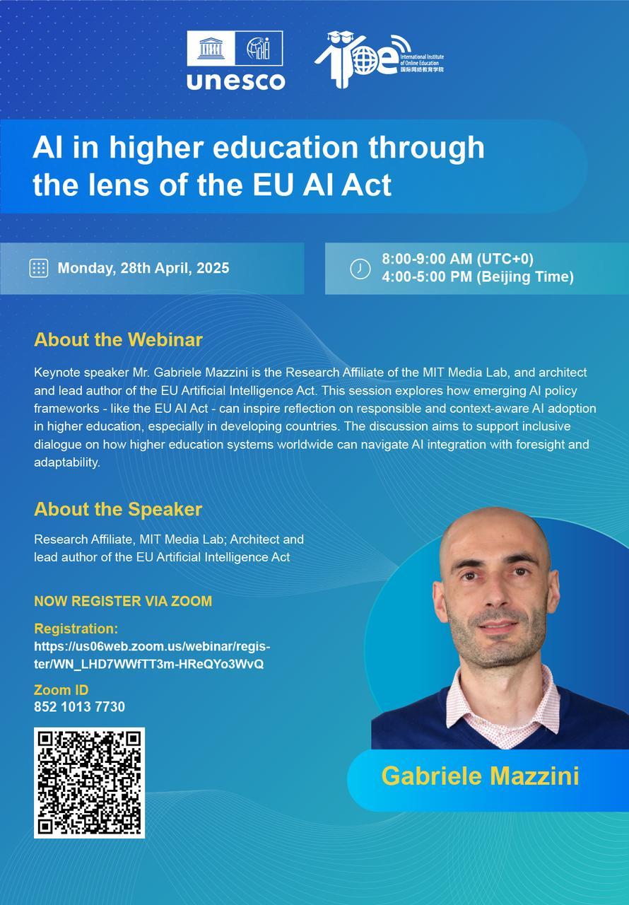 随着人工智能的迅速发展,如何在高等教育领域实现AI的负责任使用,已成为全球关注的热点话题。本次公开课主题《从欧盟人工智能法案的角度看高等教育中的人工智能》,国际网络教育学院(IIOE)荣幸邀请到欧盟人工智能法案的主要设计者、全球AI治理领域的领军人物——Gabriele Mazzini先生,探讨如何在高等教育中有效、负责任地整合AI。
