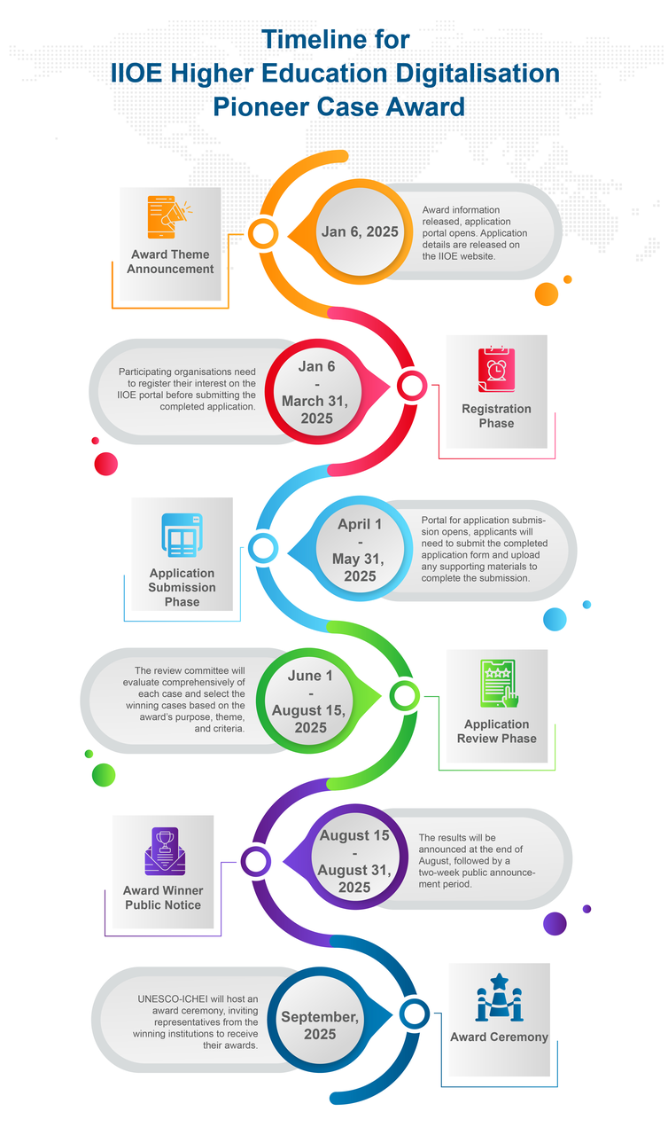 自2019年成立以来,IIOE已发展成为覆盖全球11个次区域、41个国家、超过120所高等教育机构(HEIs)的国际网络,其中包括设立在非洲和亚洲的12个IIOE国家中心。这些国家中心在高等教育人才队伍赋能及推动高等教育机构数字化转型方面取得了显著进展。发展至今,总结和分享IIOE国家中心优秀实践时机已经成熟,IIOE伙伴网络期以促进经验分享和成果互鉴,激励更多本地化举措的产生。本奖项旨在奖励在以下方面表现突出的申请者: