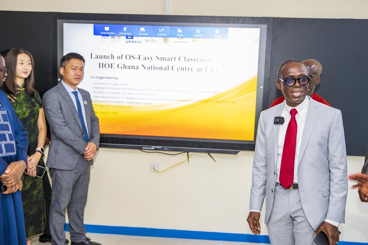 2025年7月31日,由联合国教科文组织高等教育创新中心(以下简称“创新中心”)、南方科技大学、海岸角大学(University of Cape Coast)、联合国教科文组织教育规划与管理研究所(Institute for Educational Planning and Administration under the auspices of UNESCO, 以下简称“IEPA”)以及武汉噢易云计算股份有限公司(以下简称“噢易云”)五方合作建设的智慧教室在海岸角大学正式揭牌。同时,国际网络教育学院(International Institute of Online Education, 以下简称“IIOE”)加纳国家中心也于当日正式宣布成立,成为IIOE与伙伴院校在全球设立的第13个国家中心。本次活动汇聚了包括政府代表、大学校长、国际合作伙伴及师生逾400人参与。