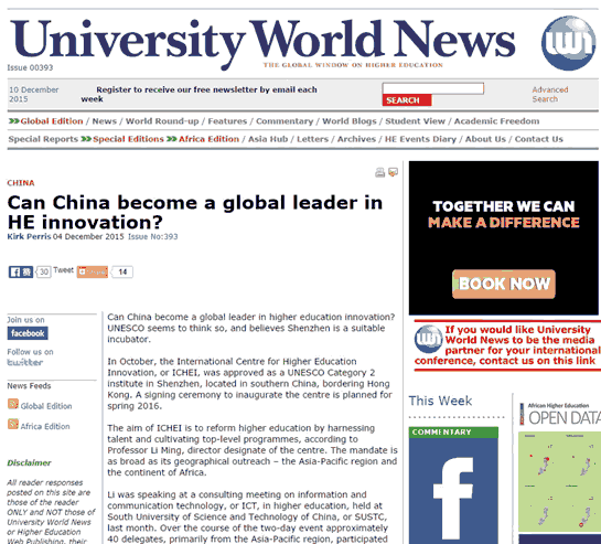 大学世界新闻网站报道截图  近日,大学世界新闻网(university world news)刊发特别报道《Can China become a global leader in HE innovation?》,从中国参与国际高等教育改革的视角,介绍联合国教科文卫二类机构——国际高等教育创新中心获批在深圳成立,以及南方科技大学所担负的重要角色和国际高等教育创新中心的宗旨使命。我们对该文进行编译整理后转发,以飨读者。大学世界新闻网是全球首家报道世界高等教育新闻的出版机构。作为高等教育的环球之窗,其总部位于伦敦,分支机构分布于迪拜、蒙特利尔、哥本哈根和墨尔本。全球具备丰富教育经验的知名记者为该网撰文,向关注国际高等教育发展的读者提供全新视角。 以下为原文编译:中国能成为国际高等教育改革的引领者吗? 在全球高等教育创新的浪潮中,中国能成为引领者?联合国教科文组织相信深圳是一个合适的孵化地。今年十月,国际高等教育创新中心获得联合国教科文卫组织批复成立,成为联合国教科文卫二类机构的一员。机构成立签约仪式将于2016年春天举行。南方科技大学党委书记、南科大UNESCO二类机构筹备工作组组长李铭教授